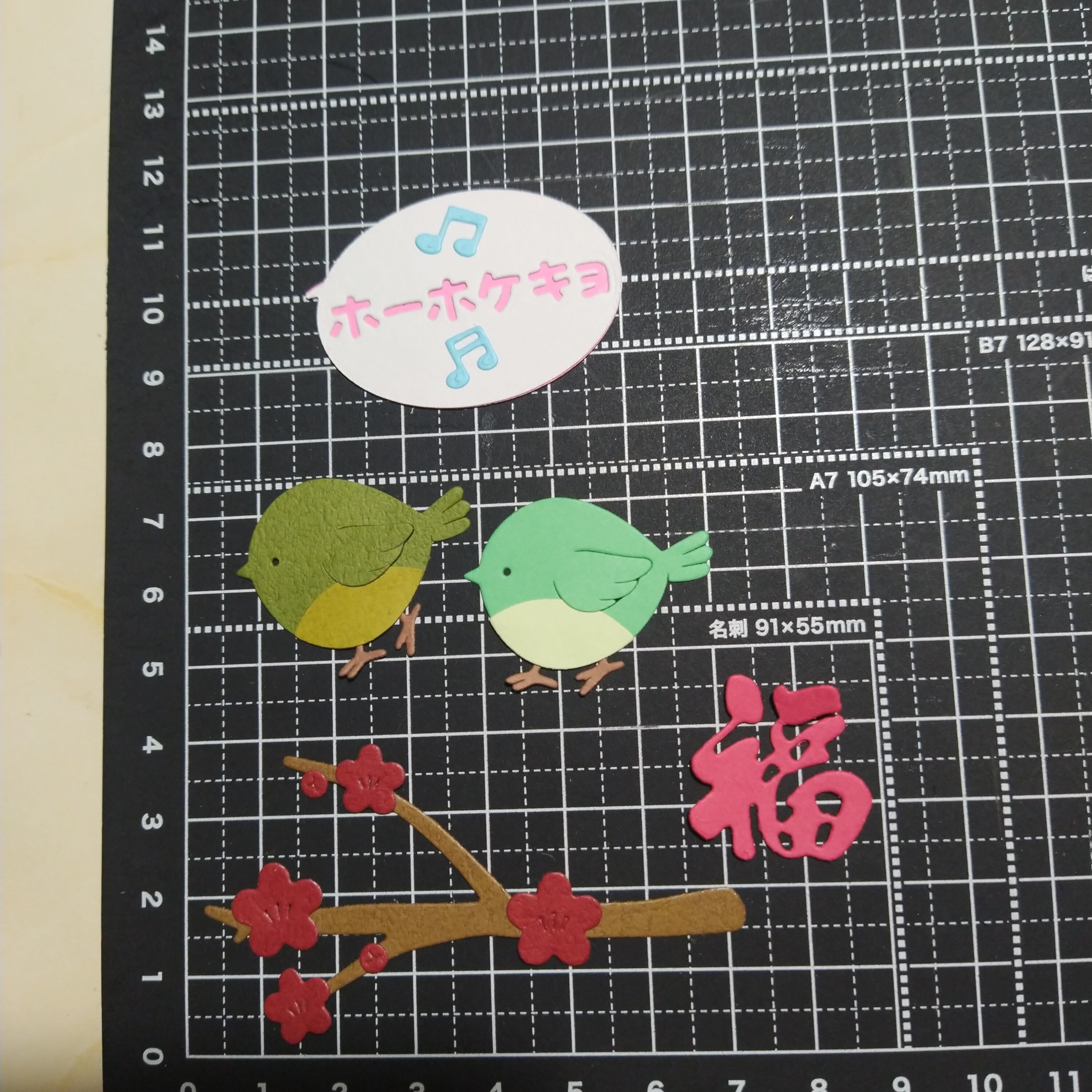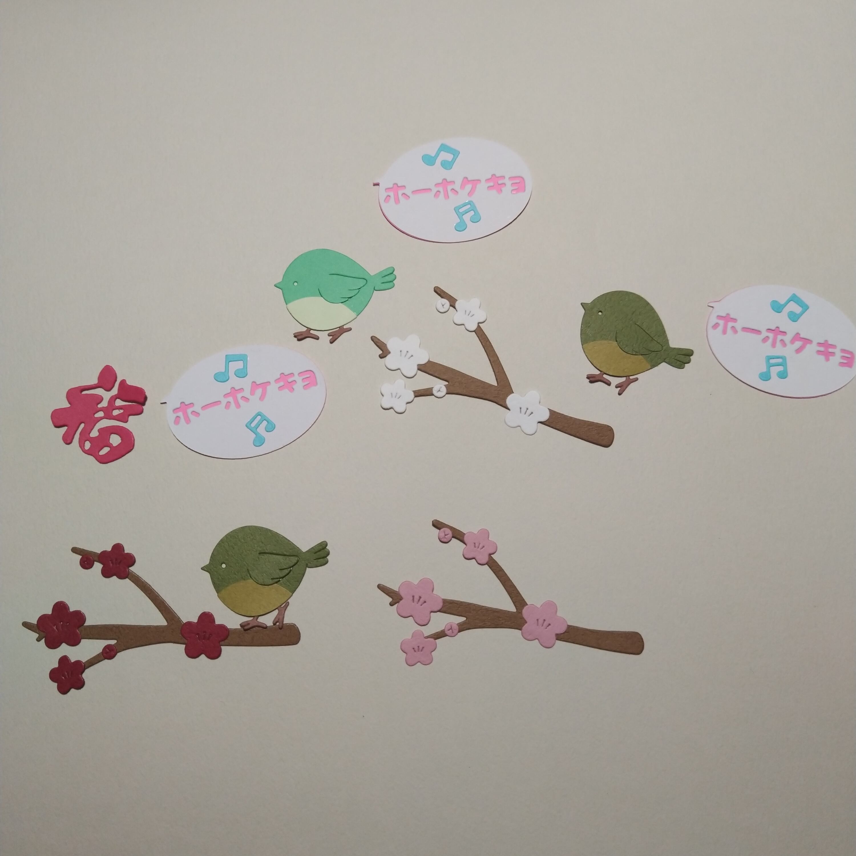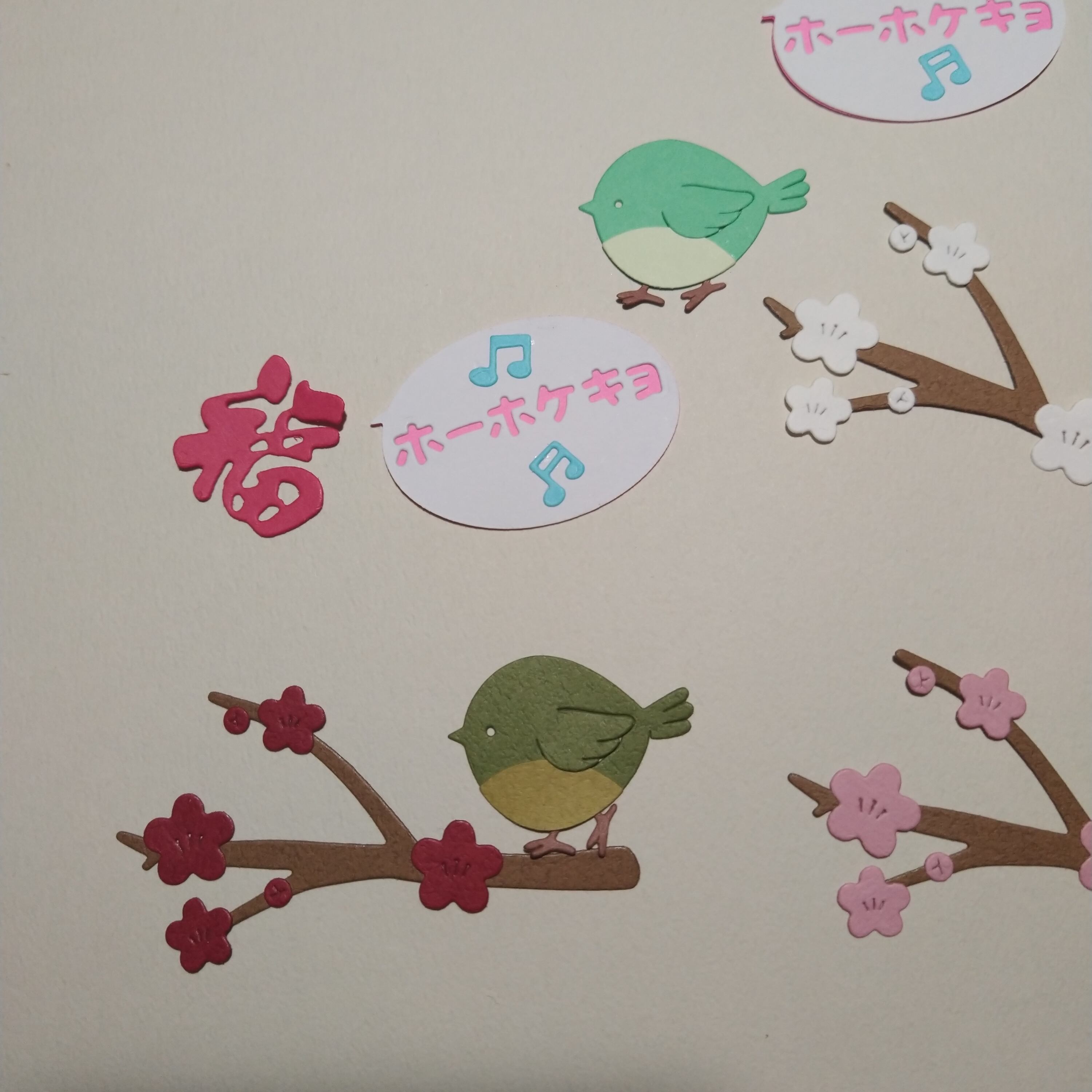 ウグイス3枚と梅の枝3枚(紅白桃色)と「ホーホケキョ」吹き出し3枚 福が1枚
